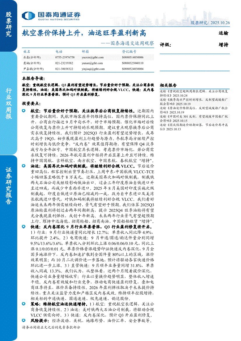 交运行业:国泰海通证券-交运行业周观察:航空票价保持上升,油运旺季盈利新高-251026