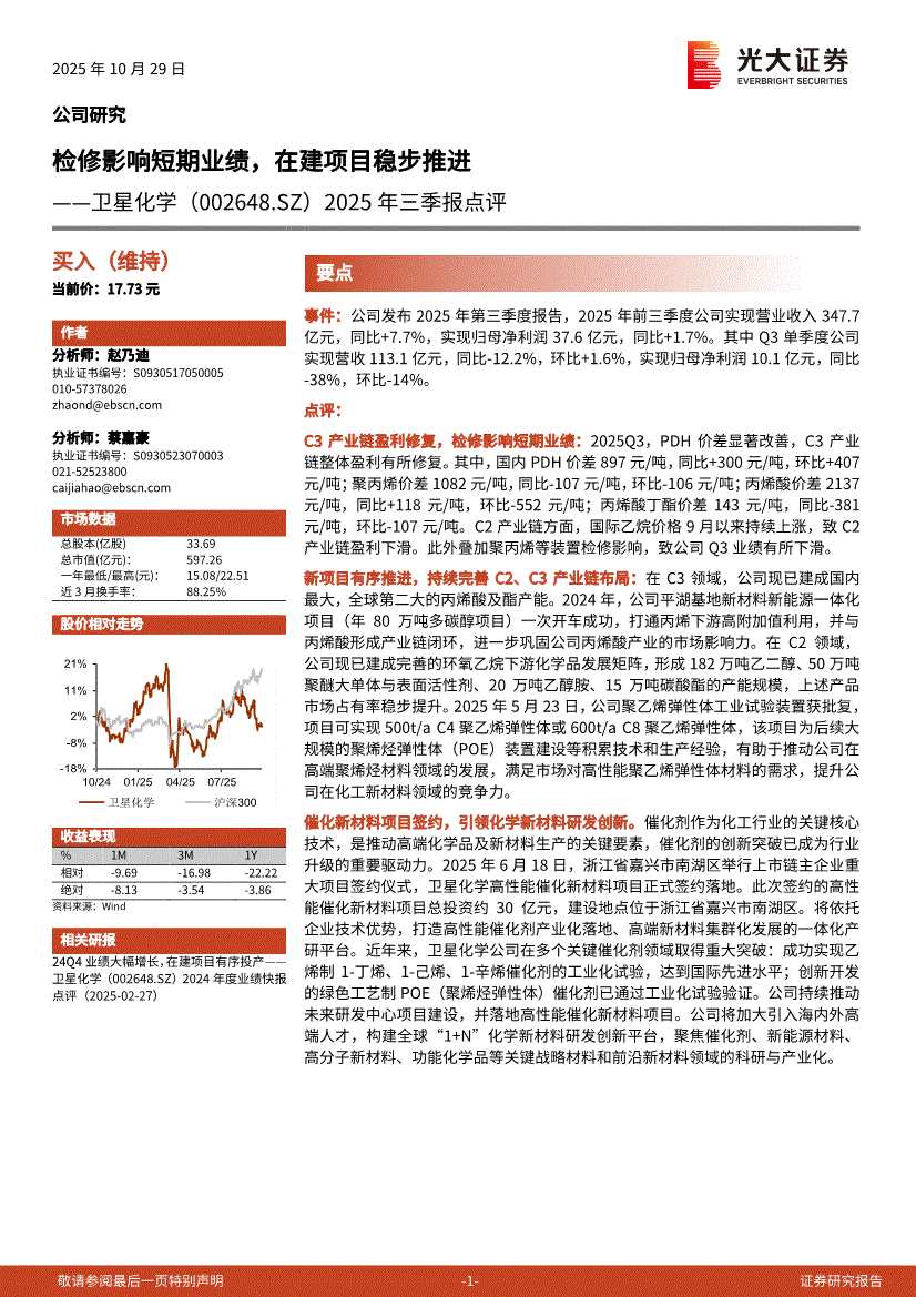 卫星化学:光大证券-卫星化学-002648-2025年三季报点评:检修影响短期业绩,在建项目稳步推进-251029