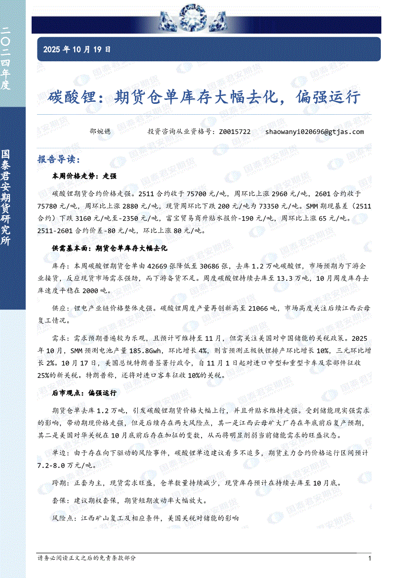 国泰君安期货-碳酸锂:仓单大幅去化,给予上行驱动-251014