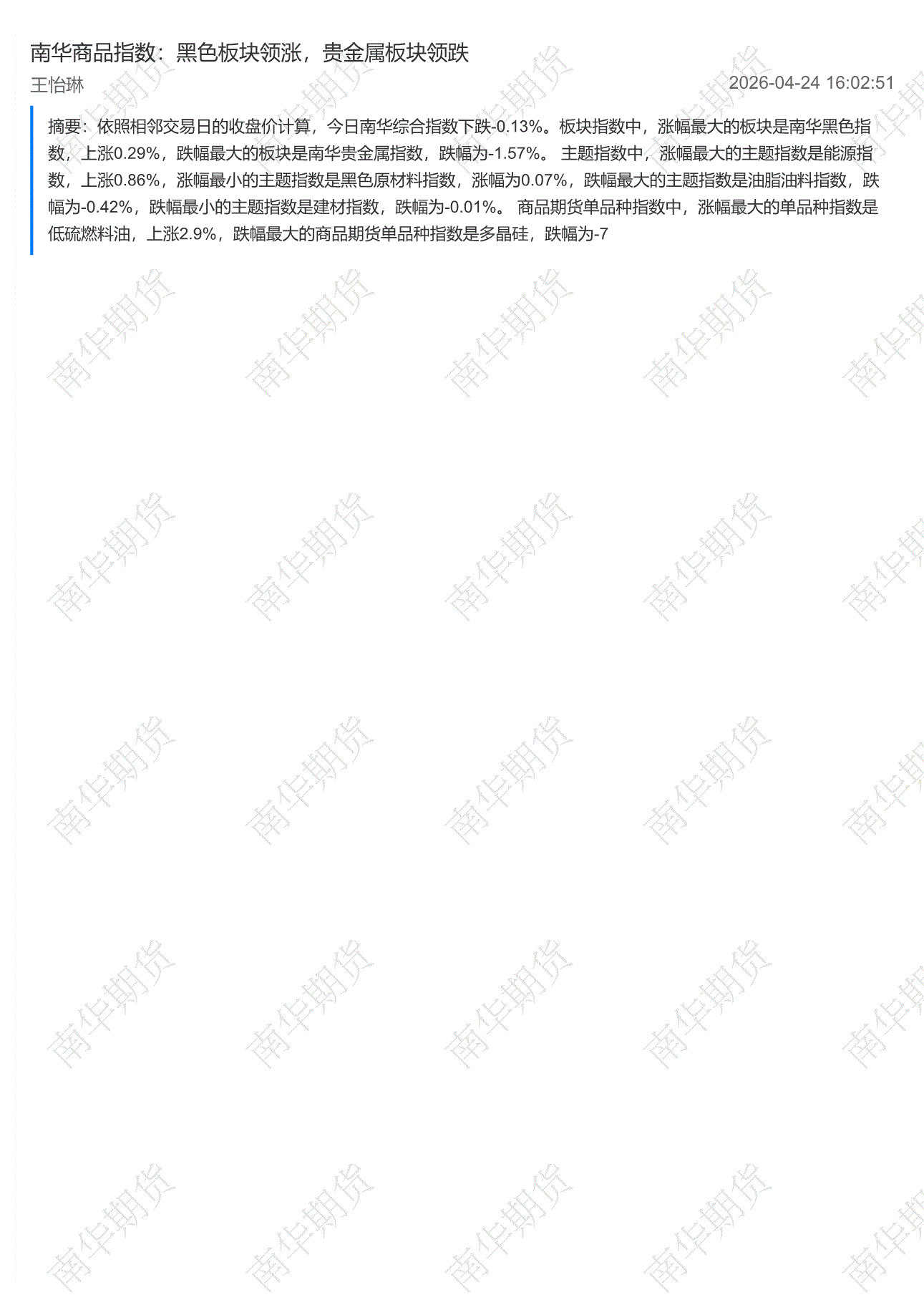 南华期货-商品指数:黑色板块领涨,贵金属板块领跌-260424