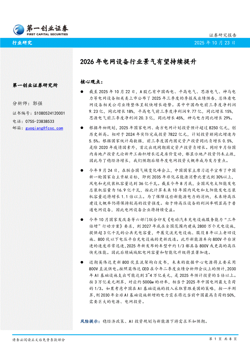 电网设备行业:第一创业-2026年电网设备行业景气有望持续提升-251023