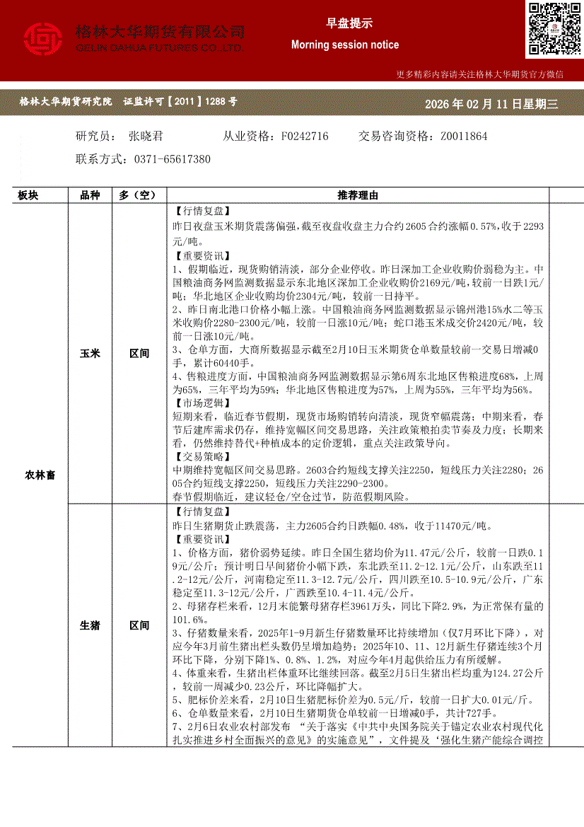 格林大华期货-早盘提示:玉米生猪鸡蛋-260211