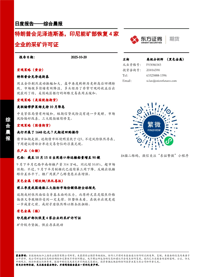 东证期货-综合晨报:特朗普会见泽连斯基,印尼能矿部恢复4家企业的采矿许可证-251020
