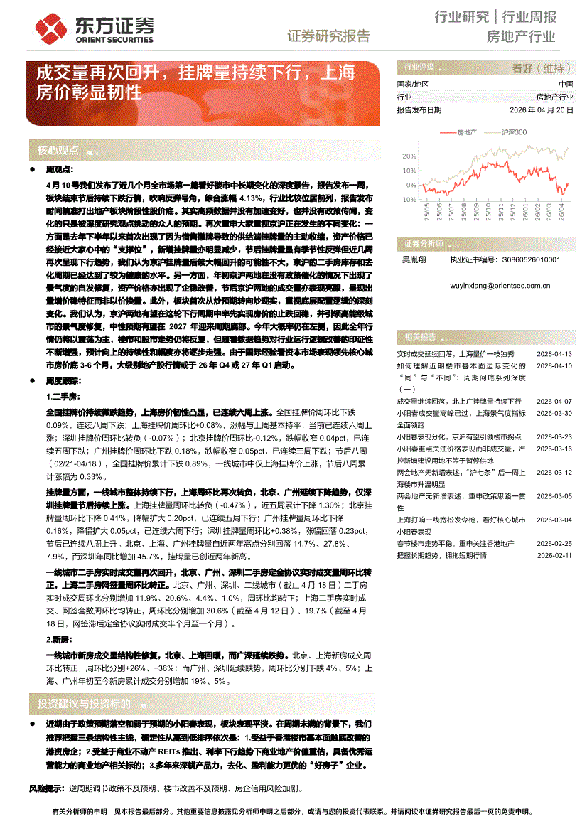 房地产行业:东方证券-房地产行业周报:成交量再次回升,挂牌量持续下行,上海房价彰显韧性-260420