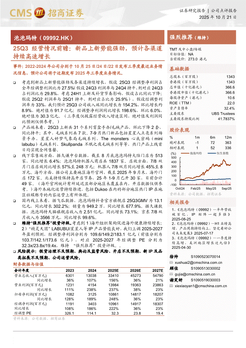 泡泡玛特:招商证券-泡泡玛特-9992.HK-25Q3经营情况前瞻:新品上新势能强劲,预计各渠道持续高速增长-251021