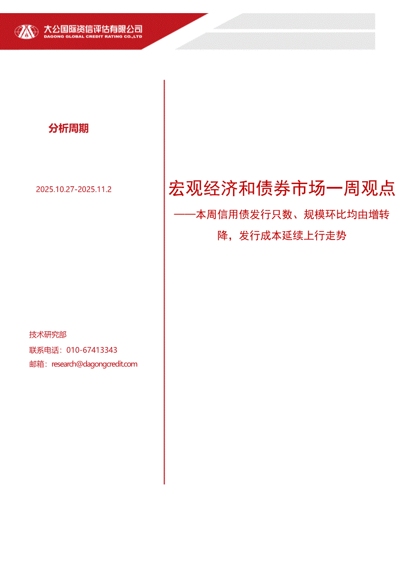 大公国际-宏观经济和债券市场一周观点:本周信用债发行只数、规模环比均由增转降,发行成本延续上行走势-251102
