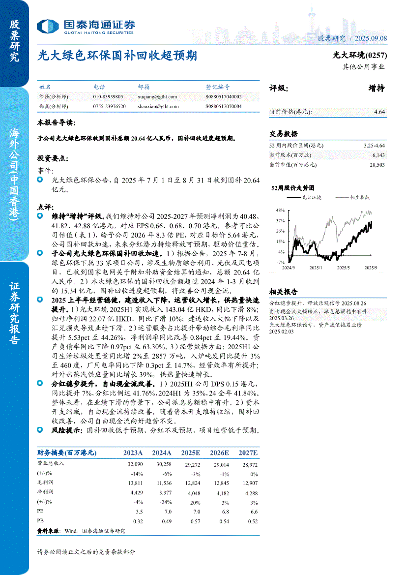 光大环境:国泰海通证券-光大环境-0257.HK-光大绿色环保国补回收超预期-250908
