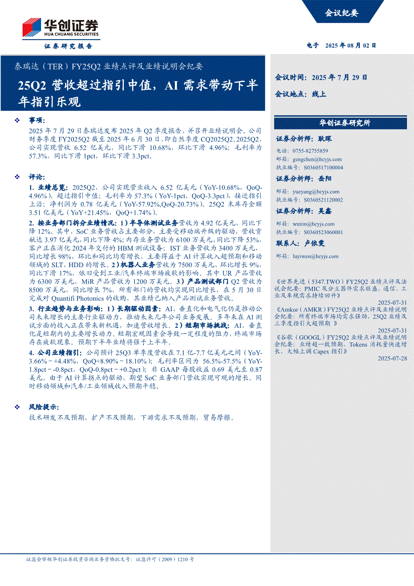 华创证券-泰瑞达-TER.US-FY25Q2业绩点评及业绩说明会纪要:25Q2营收接近超过指引中值上沿,AI需求带动下半年指引乐观-250802