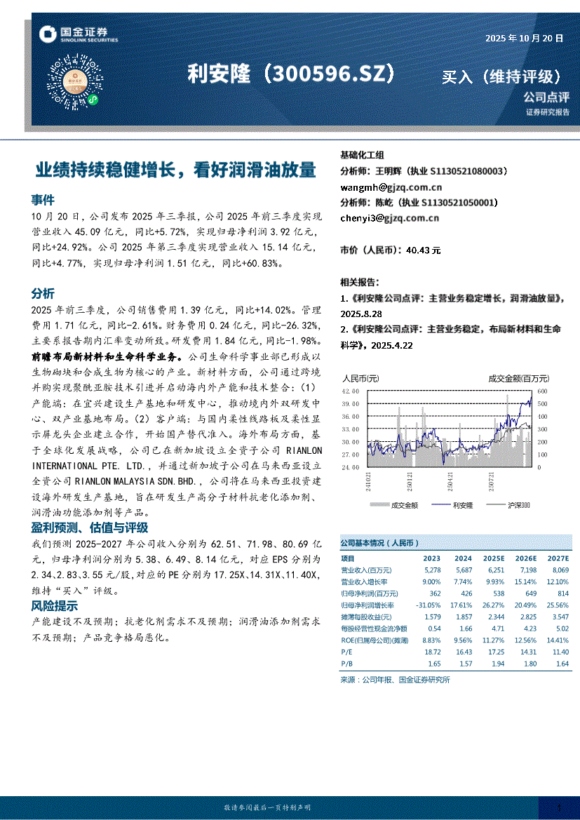 利安隆:国金证券-利安隆-300596-业绩持续稳健增长,看好润滑油放量-251020