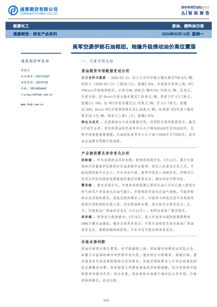 通惠期货-原油、燃料油日报:美军空袭伊朗石油枢纽,地缘升级推动油价高位震荡-260316