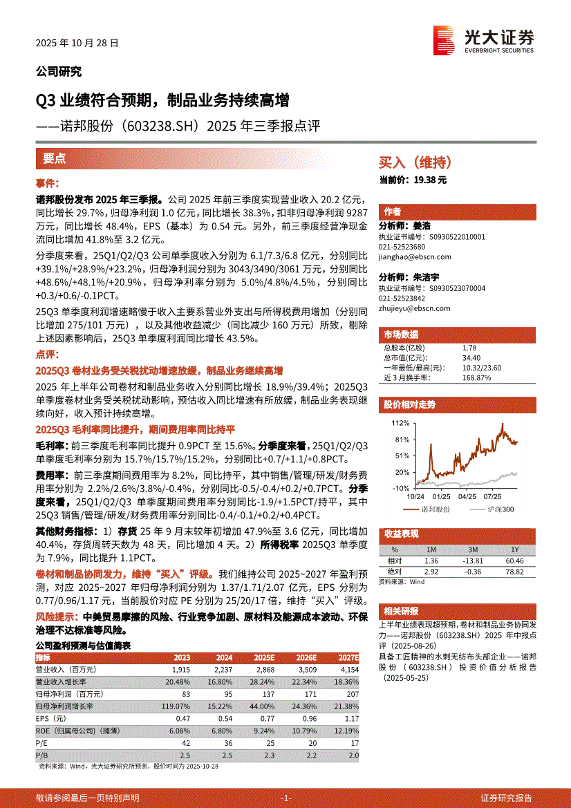 诺邦股份:光大证券-诺邦股份-603238-2025年三季报点评:Q3业绩符合预期,制品业务持续高增-251028