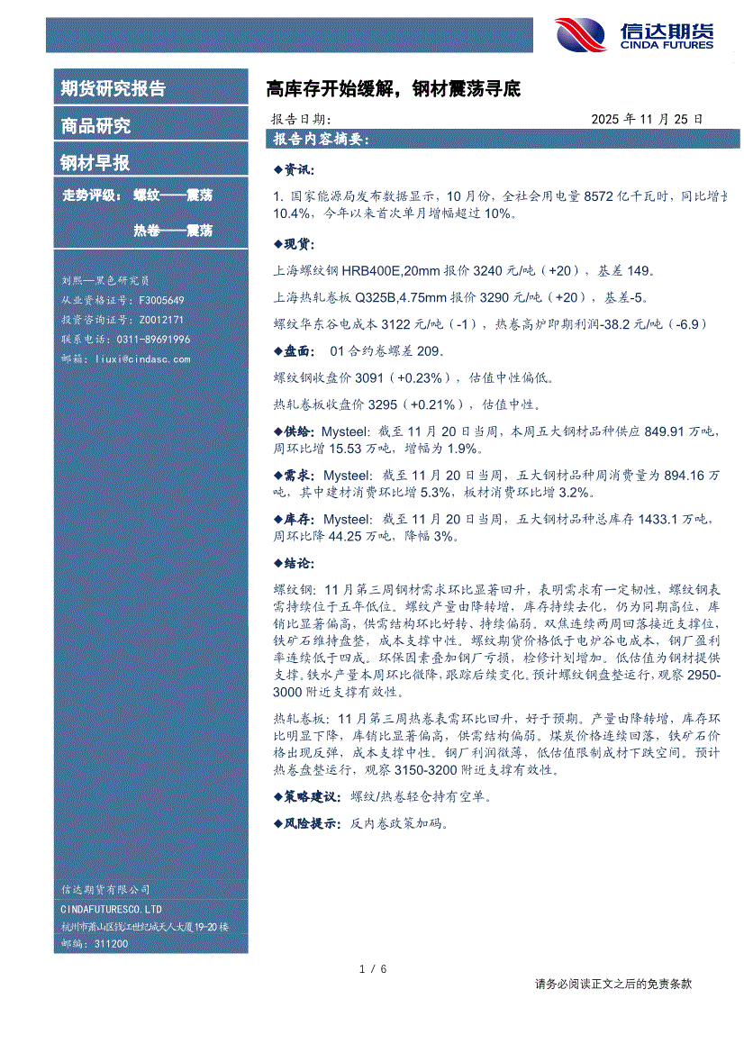 信达期货-钢材早报:高库存开始缓解,钢材震荡寻底-251125