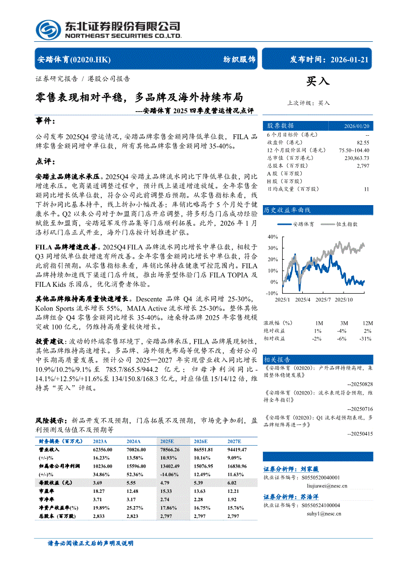 安踏体育:东北证券-安踏体育-2020.HK-2025四季度营运情况点评:零售表现相对平稳,多品牌及海外持续布局-260121