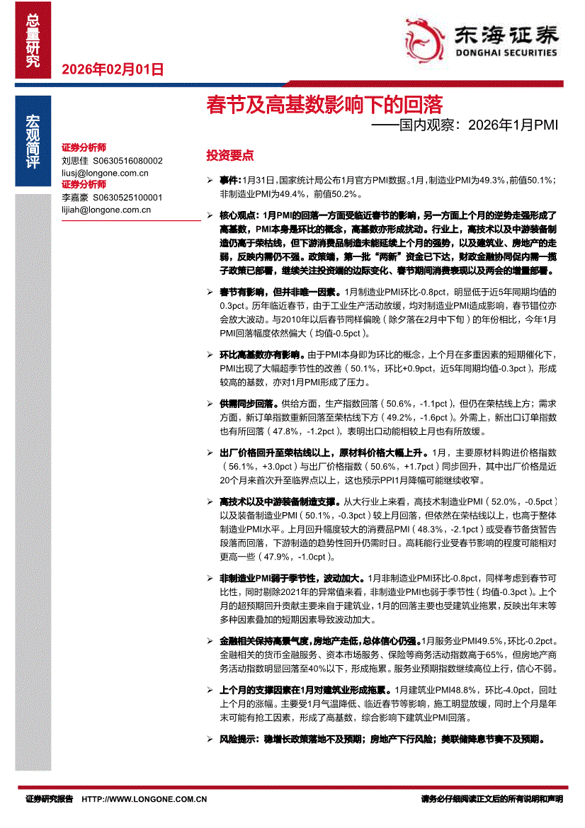 东海证券-春节及高基数影响下的回落——国内观察:2026年1月PMI-260201