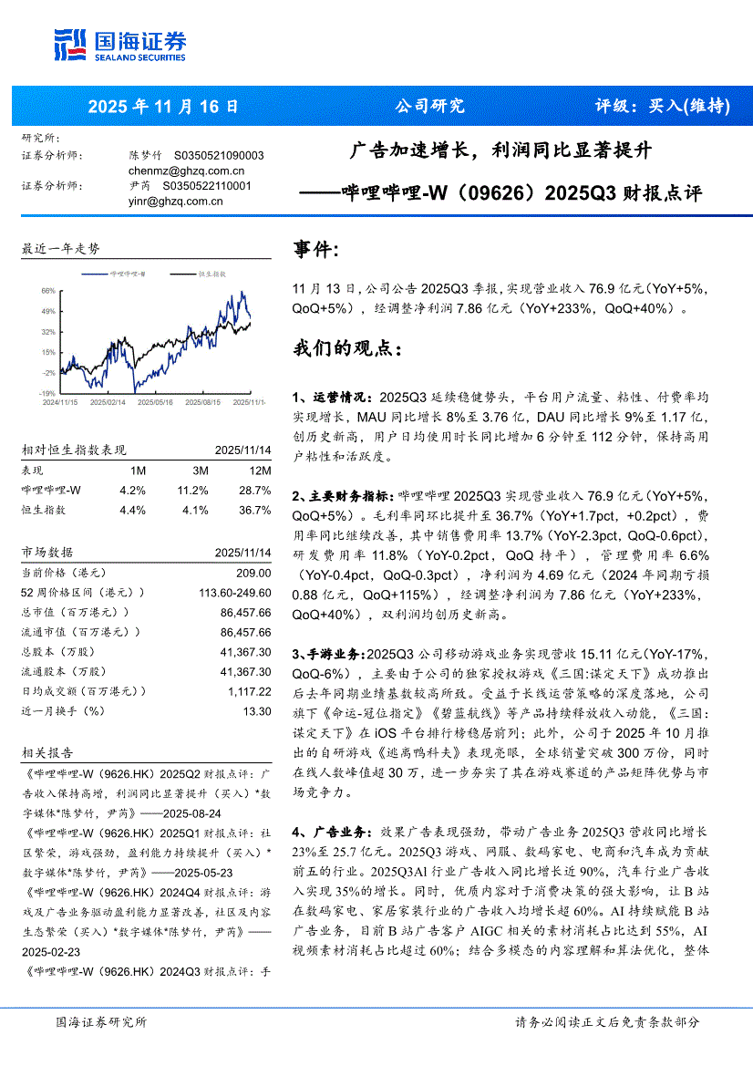 哔哩哔哩~W:国海证券-哔哩哔哩~W-9626.HK-2025Q3财报点评:广告加速增长,利润同比显著提升-251116