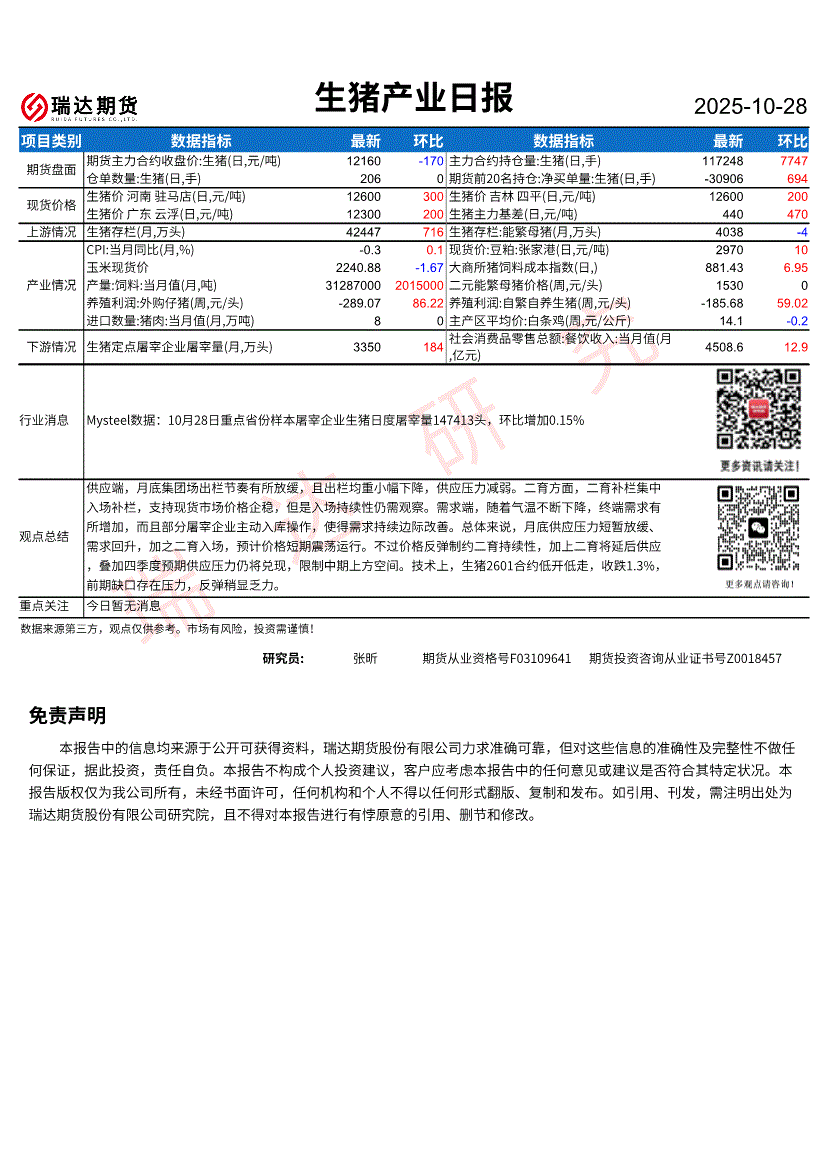 瑞达期货-生猪市场周报:二育入场降温,预计生猪偏弱运行-251017