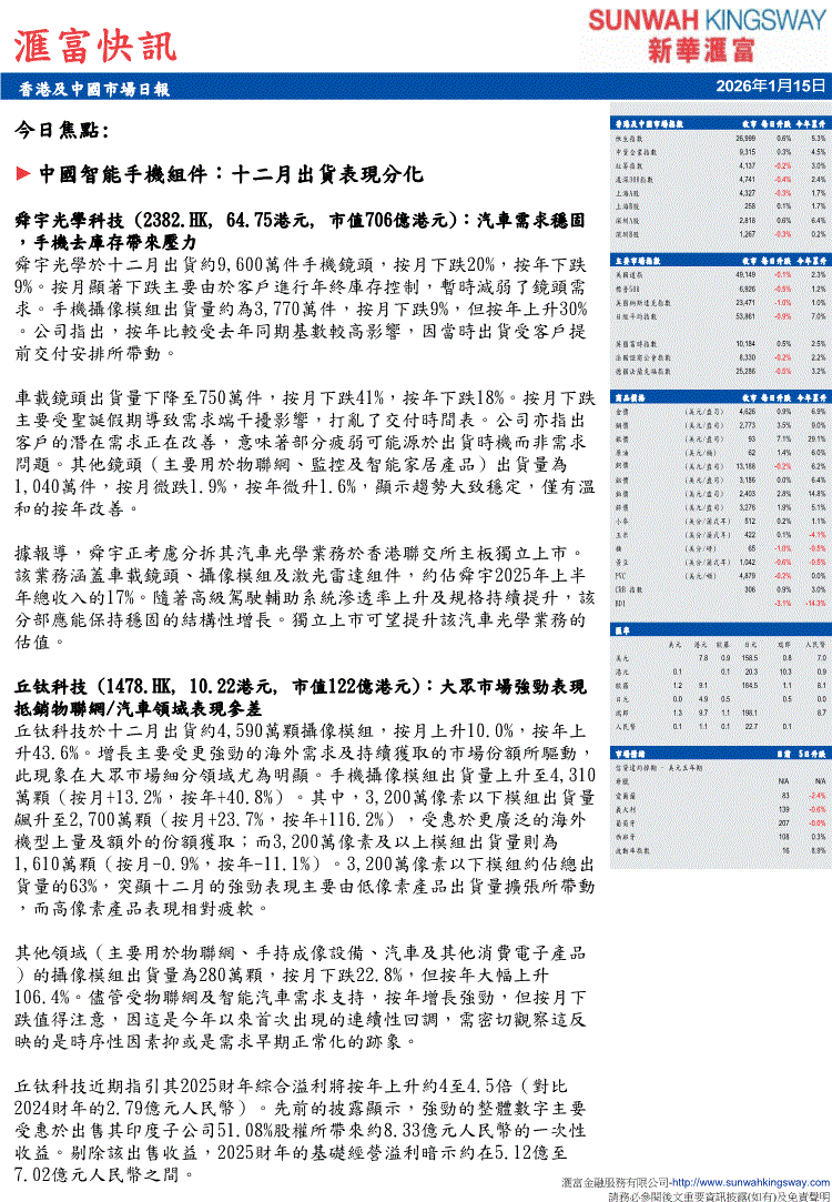 新华汇富-滙富快訊:香港及中国市场日报-260115