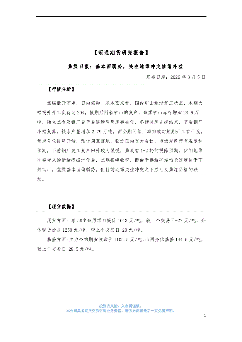冠通期货-焦煤日报:基本面弱势,关注地缘冲突情绪外溢-260305