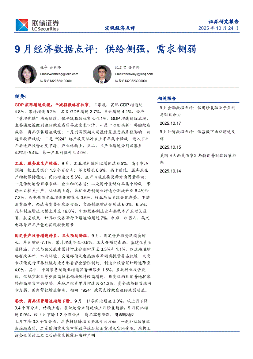 联储证券-9月经济数据点评:供给侧强,需求侧弱-251024