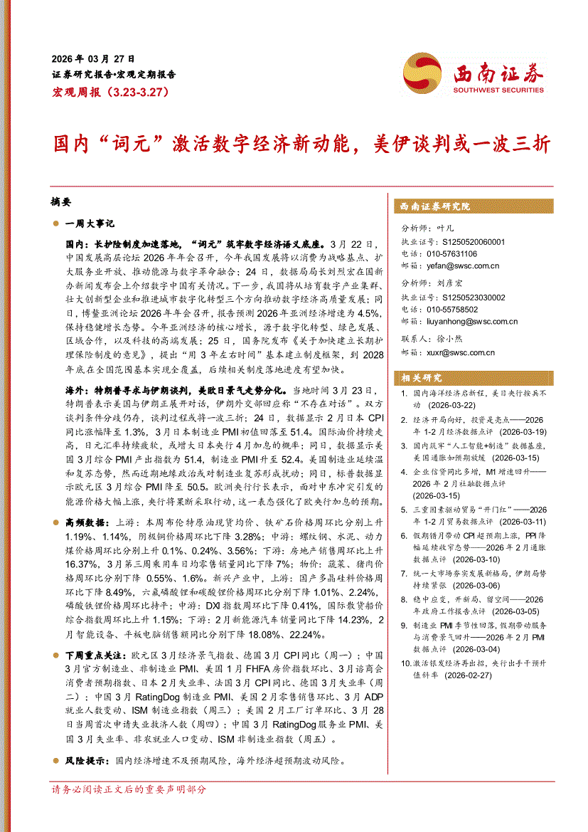 西南证券-宏观周报(3.23~3.27):国内“词元”激活数字经济新动能,美伊谈判或一波三折-260327