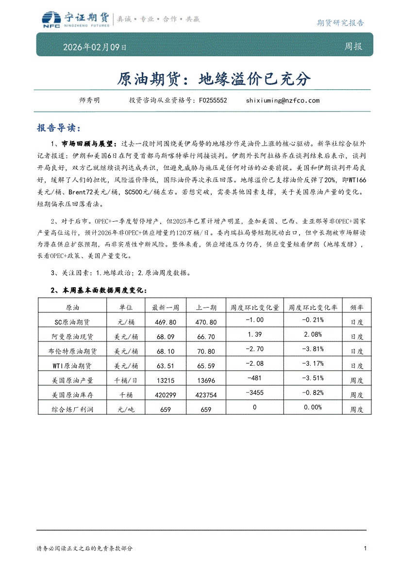 宁证期货-原油期货:地缘溢价已充分-260209