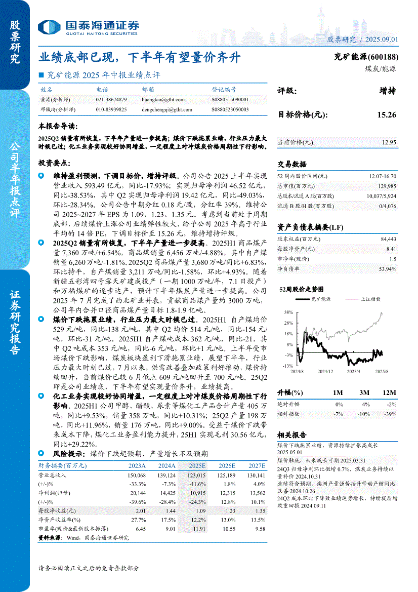 兖矿能源:国泰海通证券-兖矿能源-600188-2025年中报业绩点评:业绩底部已现,下半年有望量价齐升-250901