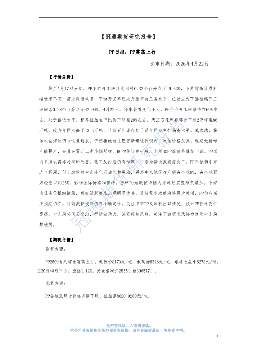 冠通期货-PP日报:PP低开后震荡上行-260424