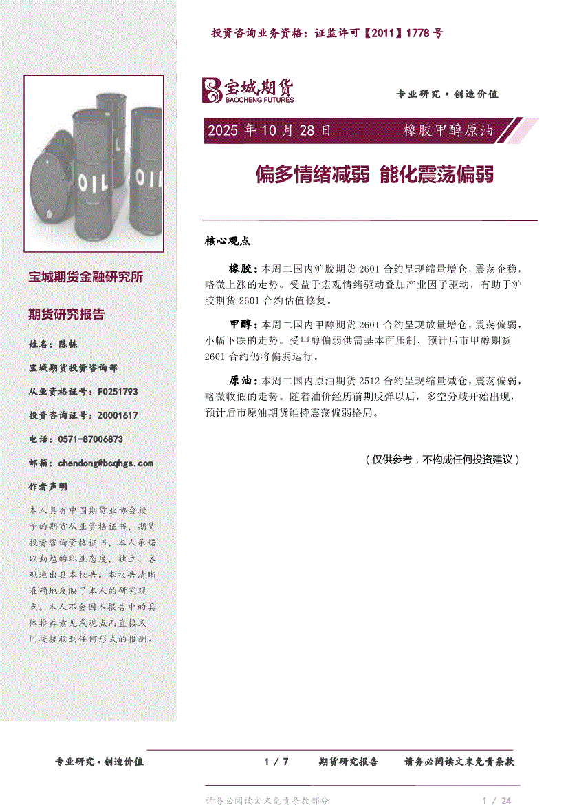 宝城期货-橡胶甲醇原油日报:偏多情绪减弱,能化震荡偏弱-251028