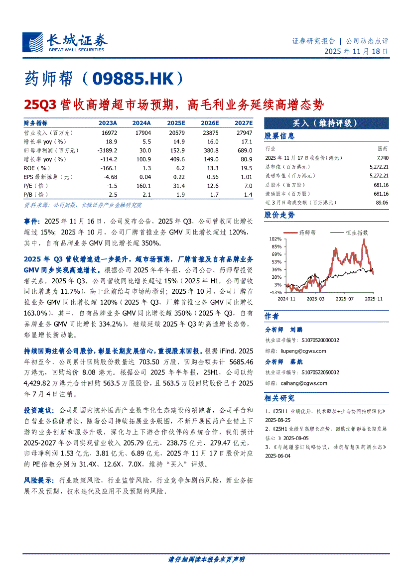 药师帮:长城证券-药师帮-9885.HK-25Q3营收高增超市场预期,高毛利业务延续高增态势-251118