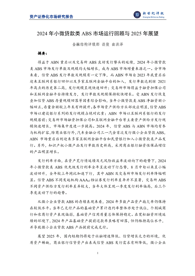新世纪评级-2024年小微贷款类ABS市场运行回顾与2025年展望-250206
