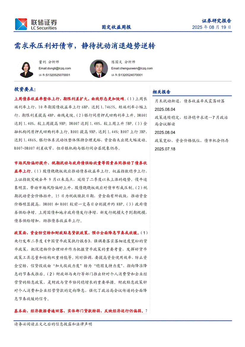 联储证券-固定收益周报:需求承压利好债市,静待扰动消退趋势逆转-250819