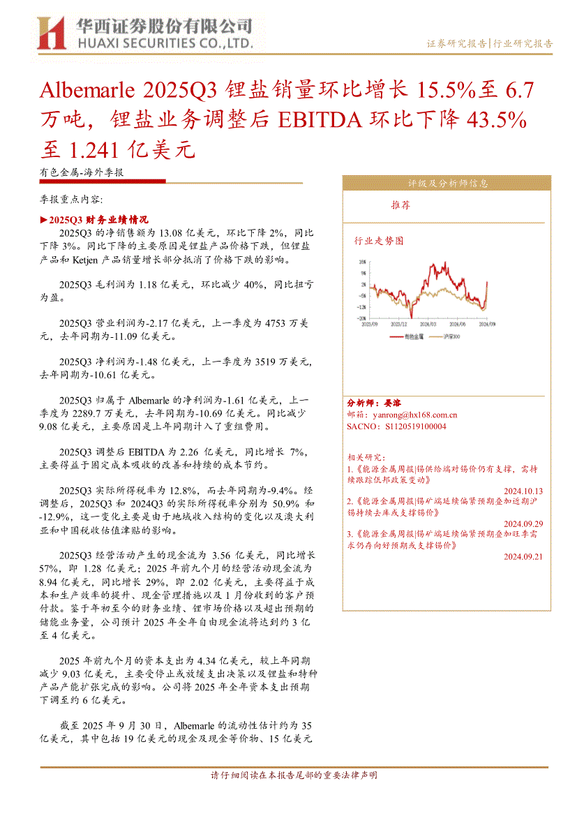 有色金属行业:华西证券-有色金属行业~海外季报:Albemarle 2025Q3锂盐销量环比增长15.5%至6.7万吨,锂盐业务调整后EBITDA环比下降43.5%至1.241亿美元-251110