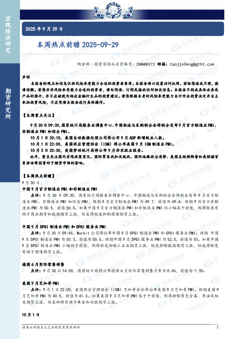 国泰君安期货-股指期货将偏强震荡,黄金、白银期货价格再创上市以来新高,原油、燃料油期货将偏强震荡,焦煤、玻璃期货将震荡偏弱,螺纹钢、铁矿石期货将偏弱震荡-250929