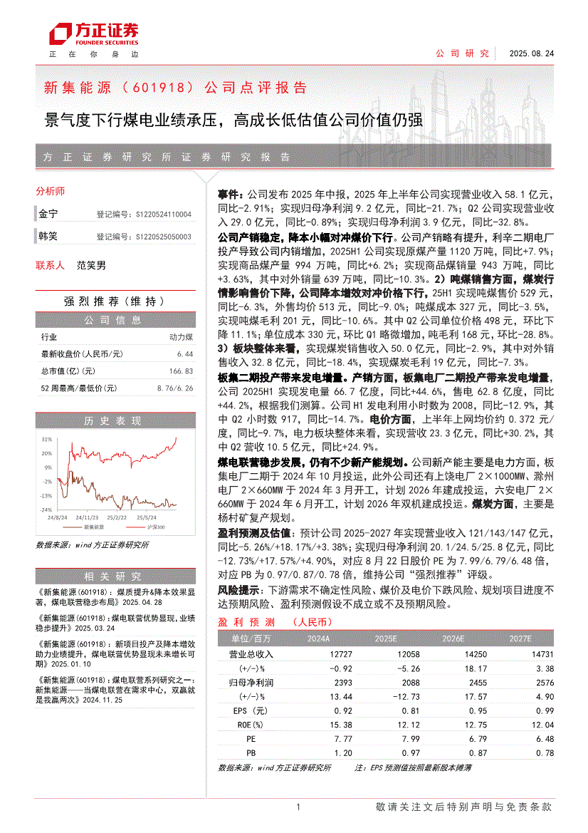 新集能源:方正证券-新集能源-601918-公司点评报告:景气度下行煤电业绩承压,高成长低估值公司价值仍强-250824