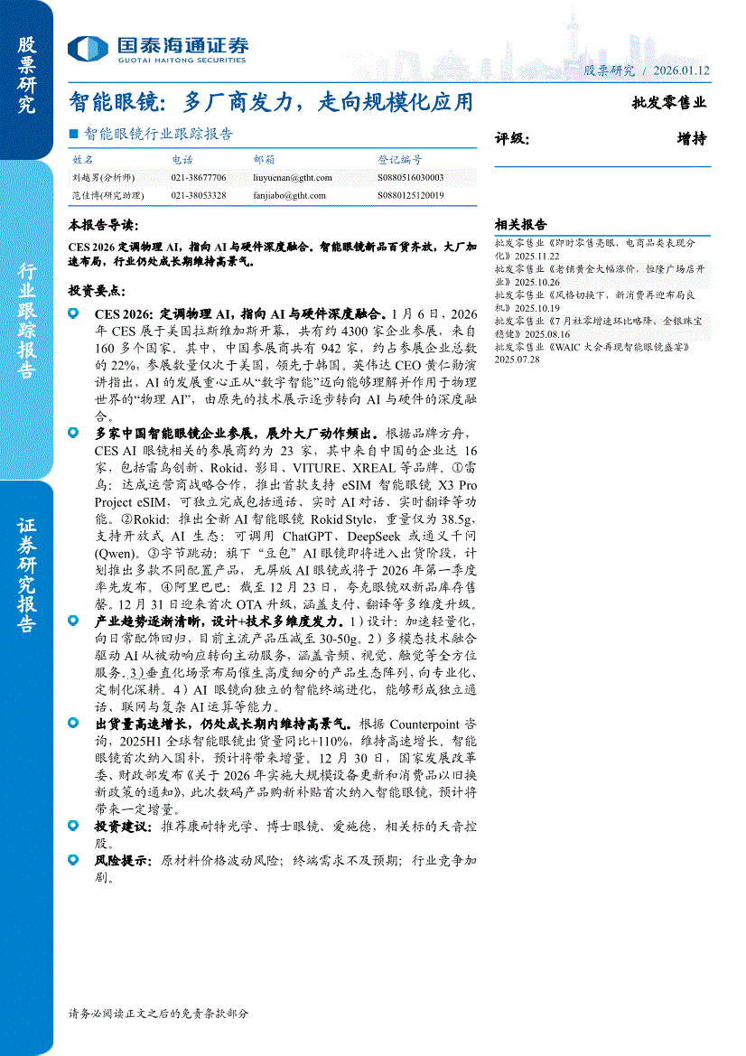 智能眼镜行业:国泰海通证券-智能眼镜行业跟踪报告:多厂商发力,走向规模化应用-260112