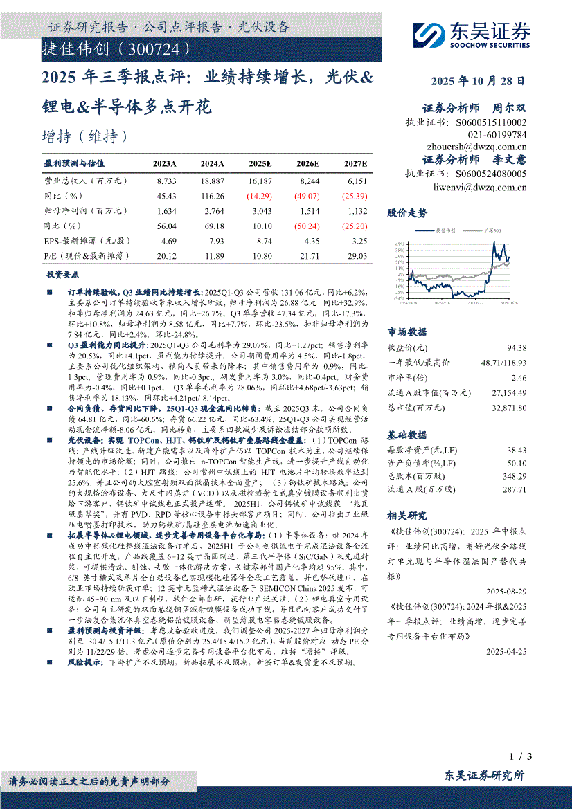 捷佳伟创:东吴证券-捷佳伟创-300724-2025年三季报点评:业绩持续增长,光伏&锂电&半导体多点开花-251028