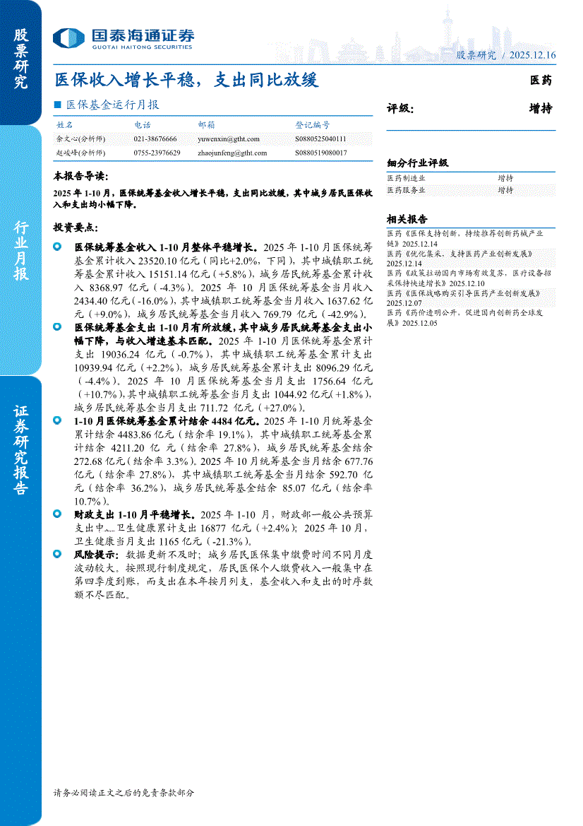 医药行业:国泰海通证券-医药行业医保基金运行月报:医保收入增长平稳,支出同比放缓-251216