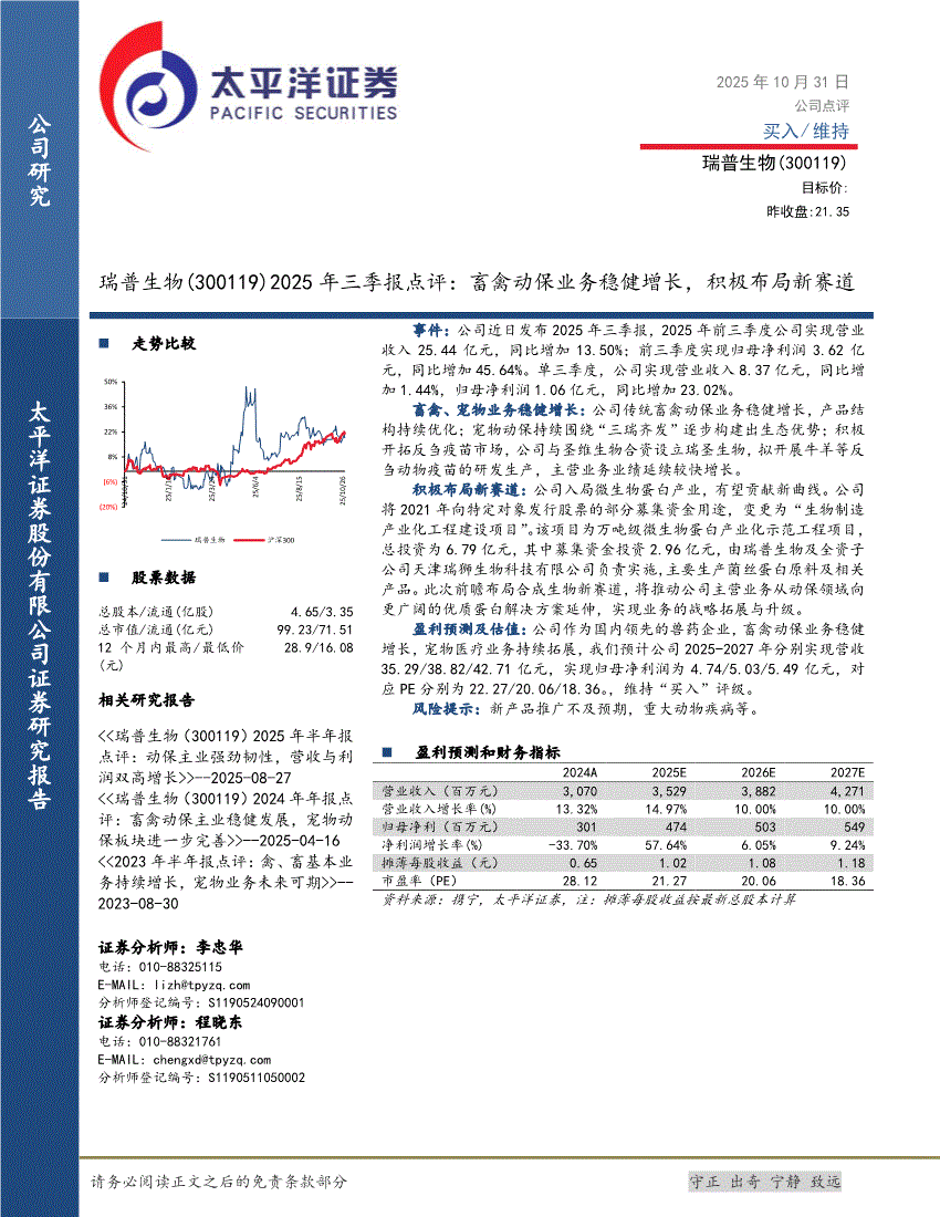 瑞普生物:太平洋证券-瑞普生物-300119-2025年三季报点评:畜禽动保业务稳健增长,积极布局新赛道-251031