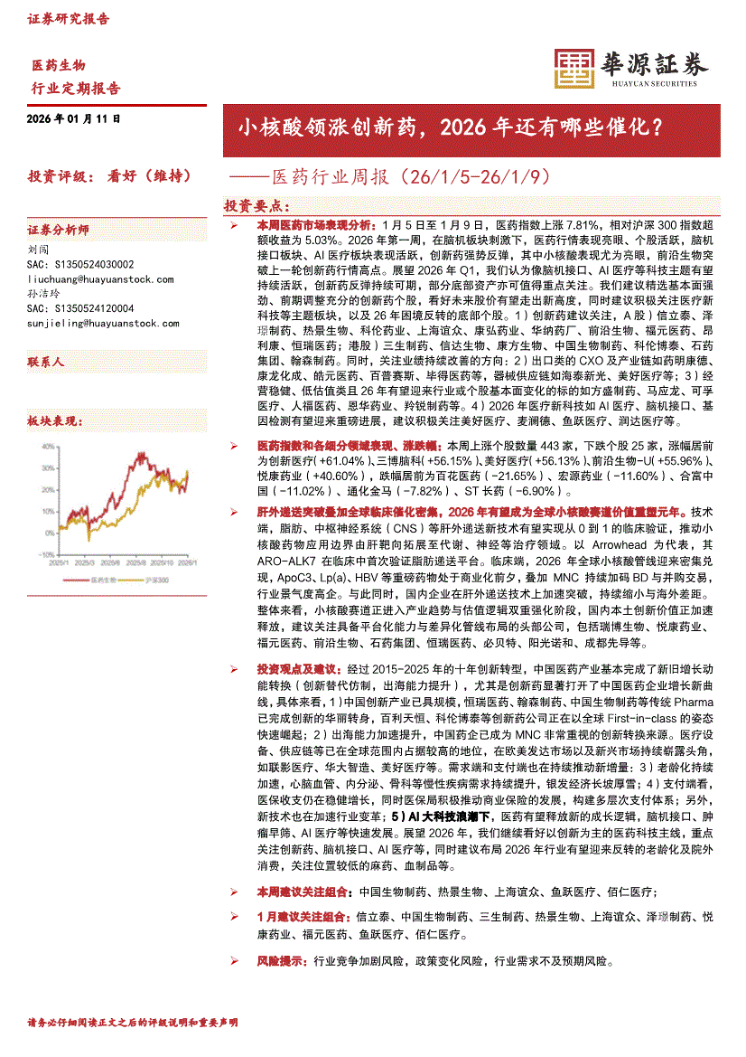 医药行业:华源证券-医药行业周报:小核酸领涨创新药,2026年还有哪些催化?-260111