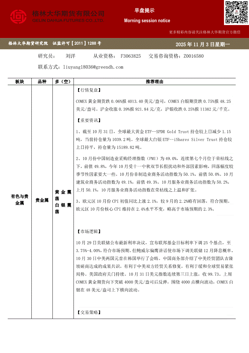 格林大华期货-早盘提示:贵金属-251103