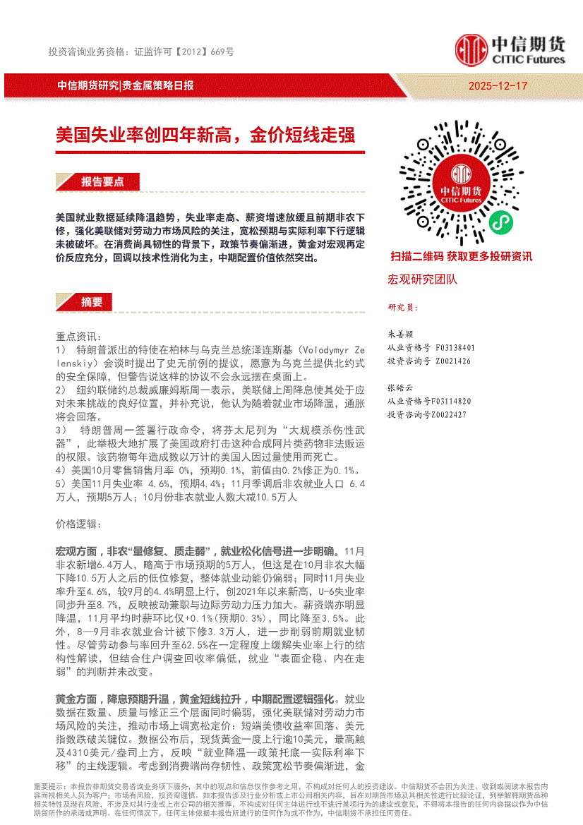 中信期货-贵金属策略日报:美国失业率创四年新高,金价短线走强-251217