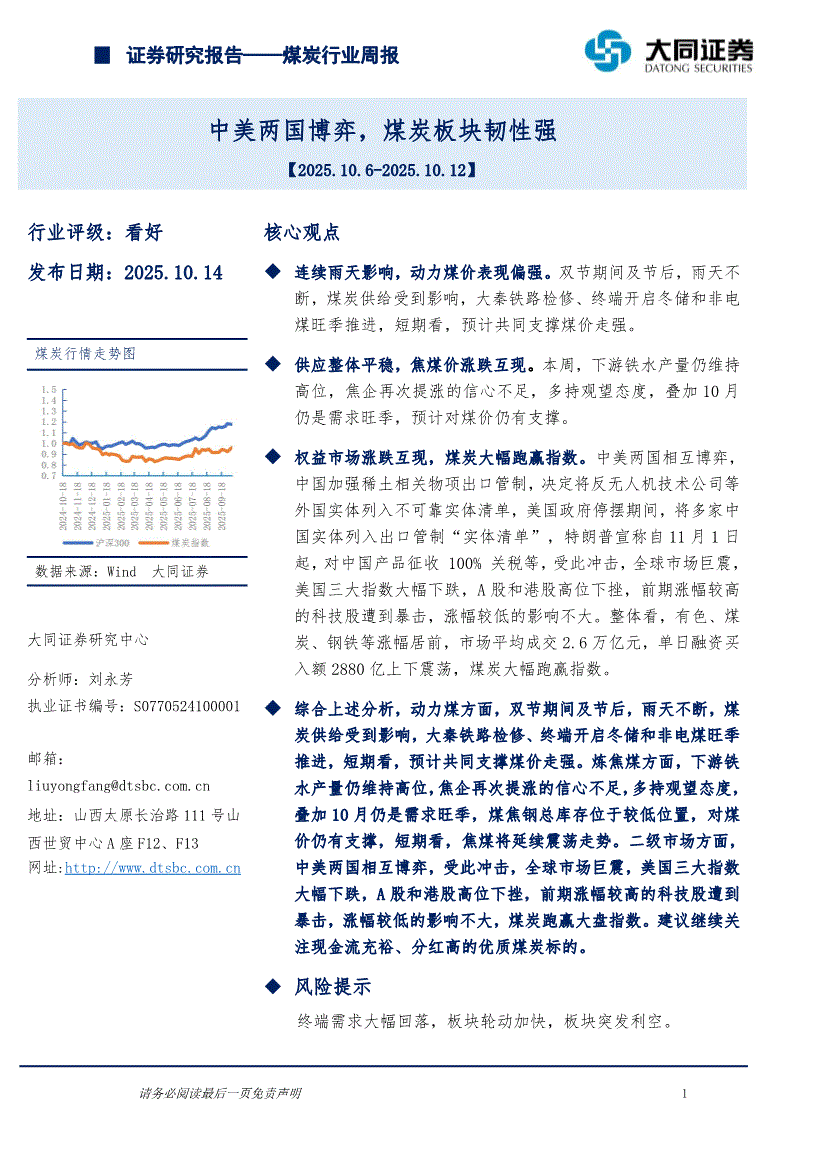煤炭行业:大同证券-煤炭行业周报:中美两国博弈,煤炭板块韧性强-251014