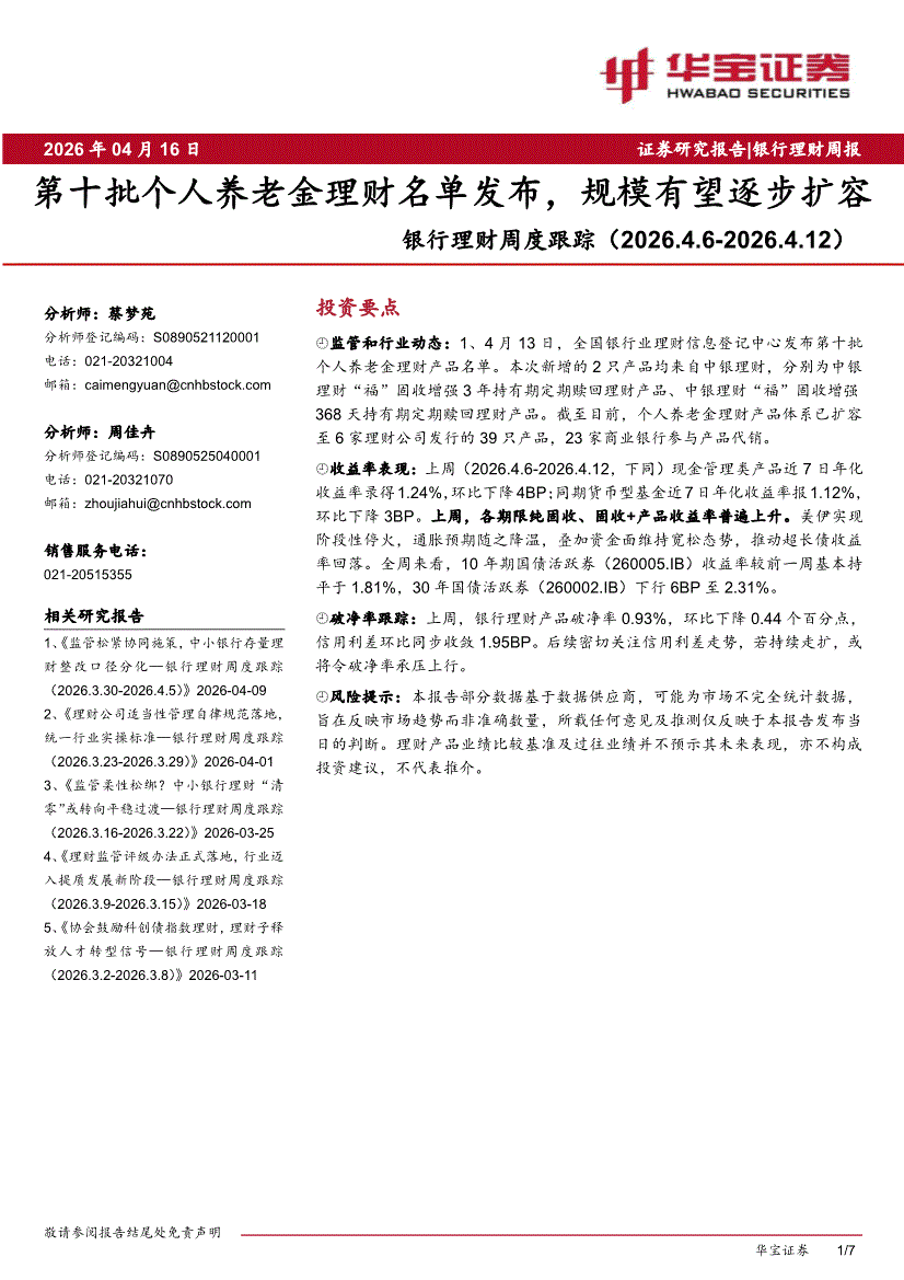 银行业:华宝证券-银行业理财周度跟踪:第十批个人养老金理财名单发布,规模有望逐步扩容-260416