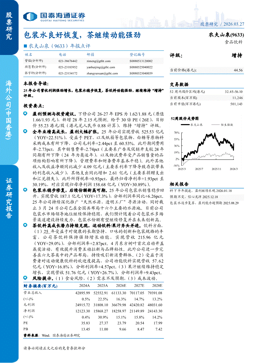 农夫山泉:国泰海通证券-农夫山泉-9633.HK-年报点评:包装水良好恢复,茶继续动能强劲-260327