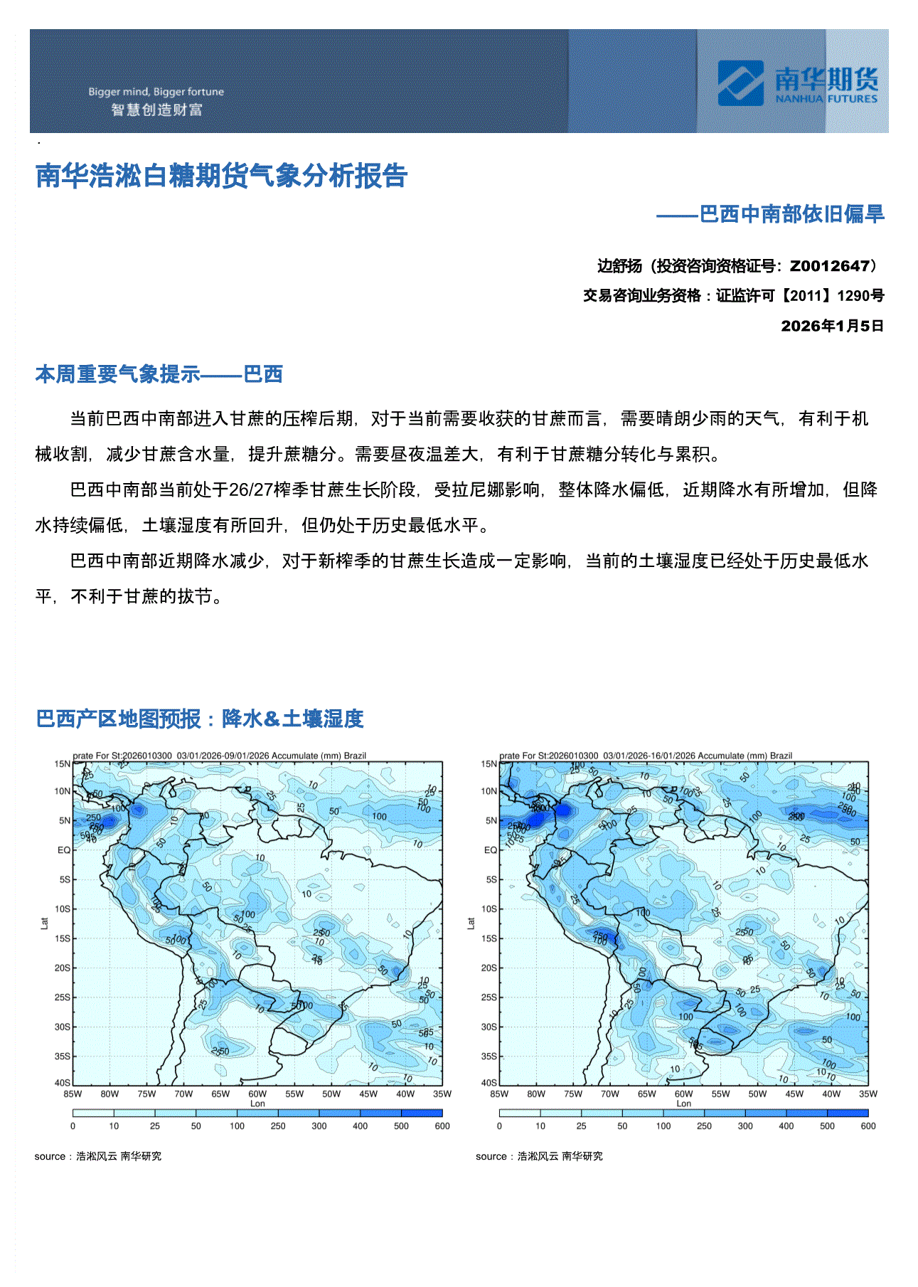 南华期货-浩淞白糖期货气象分析报告:巴西中南部依旧偏旱-260105