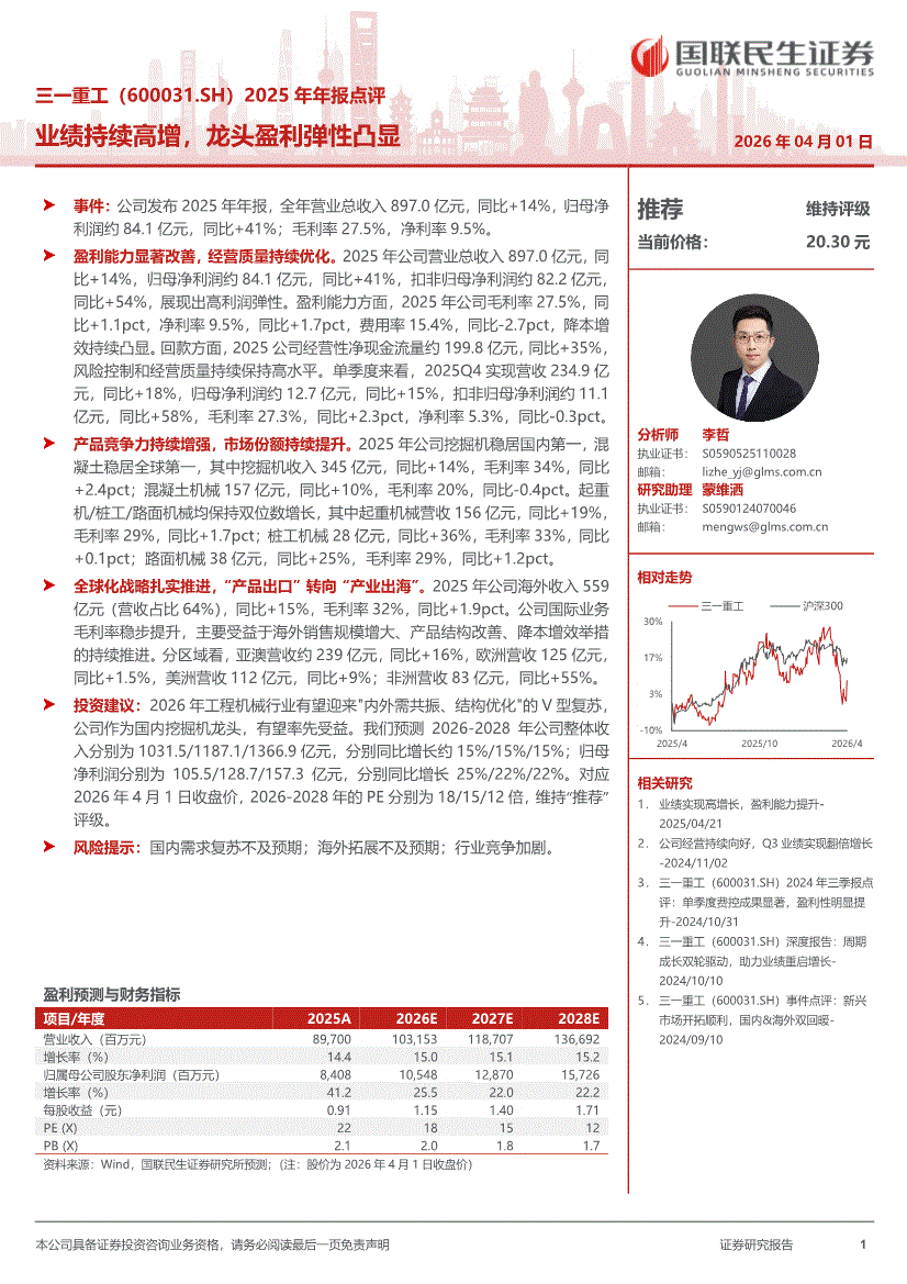 三一重工:国联民生证券-三一重工-600031-2025年年报点评:业绩持续高增,龙头盈利弹性凸显-260401