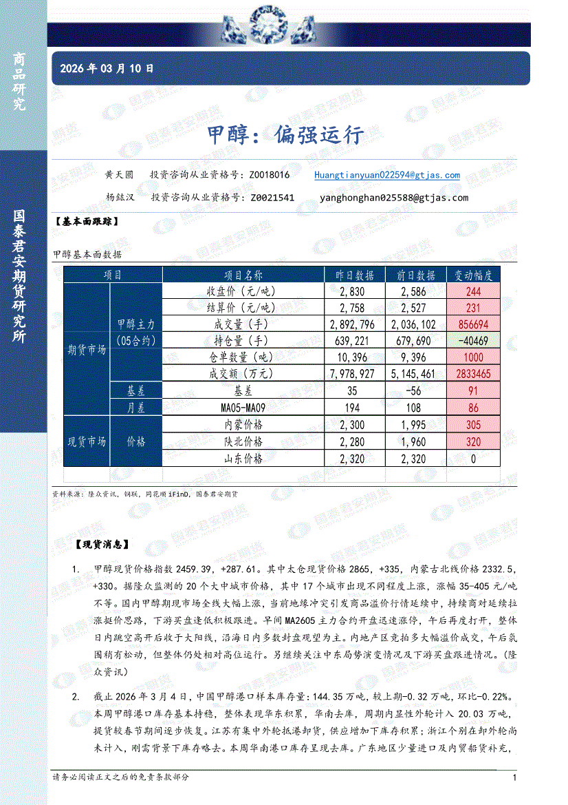 国泰君安期货-甲醇:偏强运行-260310