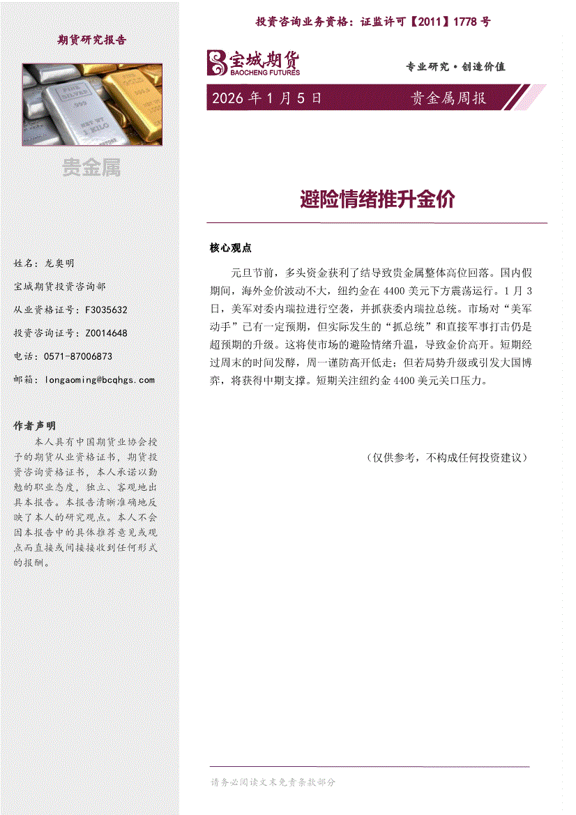 宝城期货-贵金属周报:避险情绪推升金价-260105