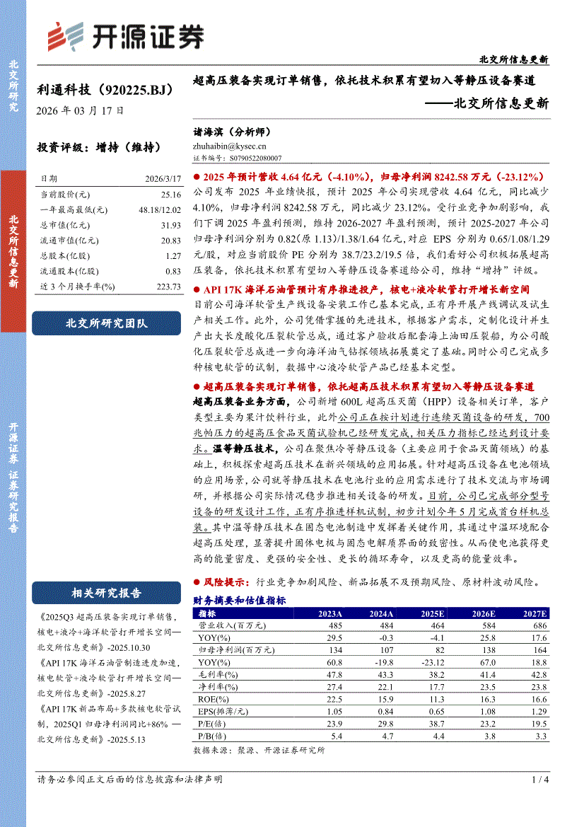 利通科技:开源证券-利通科技-920225-北交所信息更新:超高压装备实现订单销售,依托技术积累有望切入等静压设备赛道-260317