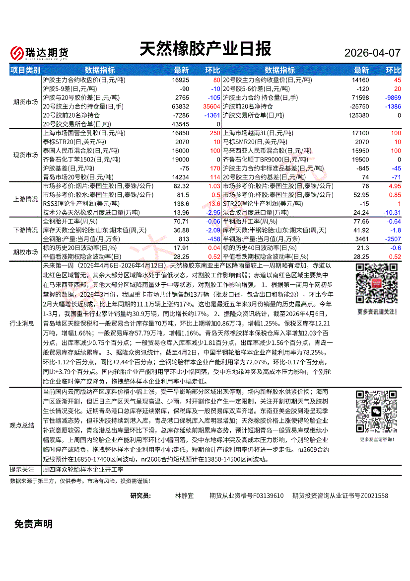 瑞达期货-天然橡胶产业日报-260407